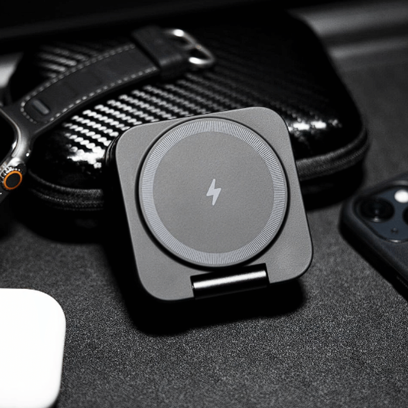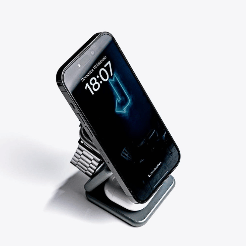 por indução, que permite carregar até três dispositivos simultaneamente,